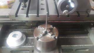 Which I didn't, so the carefully pre-prepared end is messed up. This is a rotary table which doesn't do indexing, so you have to dial up the correct absolute angle for each cut - in this instance, it's for 24 teeth, so the angle increment is a straightforward 15 degrees between teeth, or gap. The table dials up 5 degrees per rotation of the dial, so it's reasonably straightforward. Except if you're not paying attention... having a spreadsheet of tooth number and required angle is essential, but you need to double check and not be distracted by domestic queries.